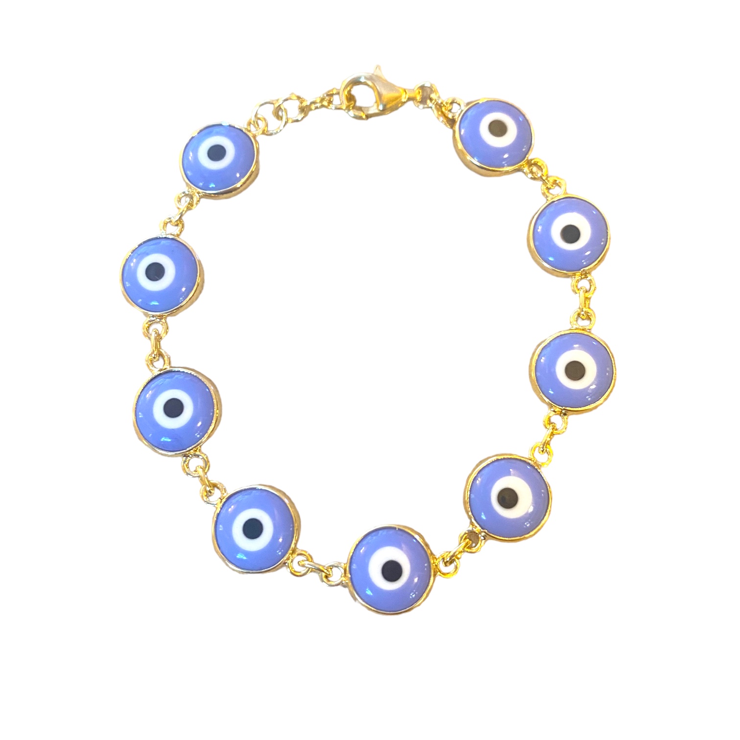 Pulseira Olho Grego Mini em prata com banho de ouro amarelo, lavanda flúor.